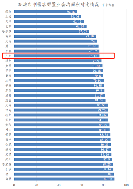 贝壳研究院发布的《2021城市刚需购房报告》中显示,深圳上海北京等城市刚需购房面积较小,仅五六十平,而作为一线城市里房价较低的广州,套均面积也仅76.18平米。