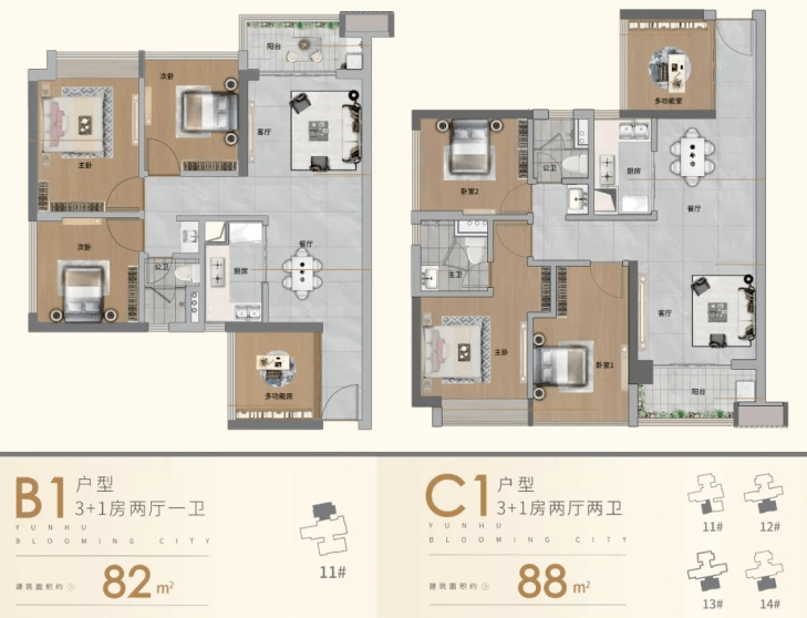 其中在四房户型中,最小面积做到了82平,非常适合刚需人群。如果想要追求双卫设计的,88平户型可以满足需求,而且为南向设计,通风采光更胜一筹。