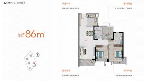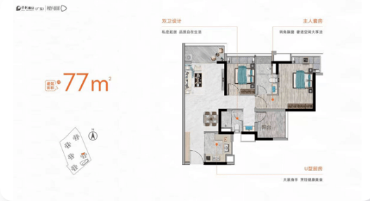 整体户型设计实用精巧,亮点颇多。最让人惊喜的是77方户型,不仅做到了三房,还设置了双卫,主卧套房设计,生活更加从容方便;而86方户型则是南向三房,通风采光俱佳。