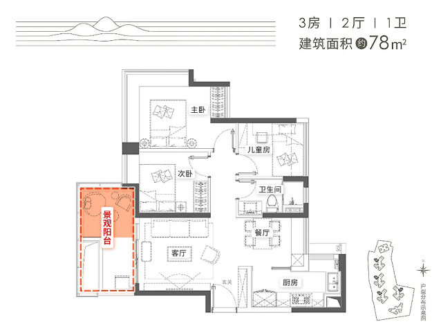 具体来说,78平为三房一卫设计,空间上并不因面积小而觉得压蹙,主卧次卧的空间让人惊喜满满,视觉上甚至不输市面上部分90+平户型的效果,算上赠送面积的话,实用率可以达到94%。