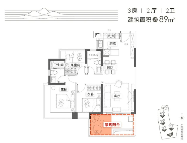 其户型也是出了名的“能打”。建面约86-89㎡不仅为三房双卫设计,还多了一个功能房,且多功能空间阔绰,做书房,游戏房均可,家庭人口多的话还可改成为四房,可谓是同等面积多一房;近9成的空间使用率,大大提高了生活舒适度。