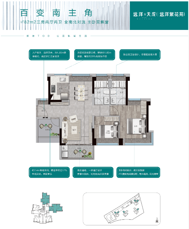其中82㎡三房两厅两卫的户型堪称一绝。主卧套间设计,还实现了双飘窗,南向270°景观窗。此外,整个户型可以说全屋飘窗,目之所及皆为拓展,据置业顾问介绍,该户型实用率超过90%!