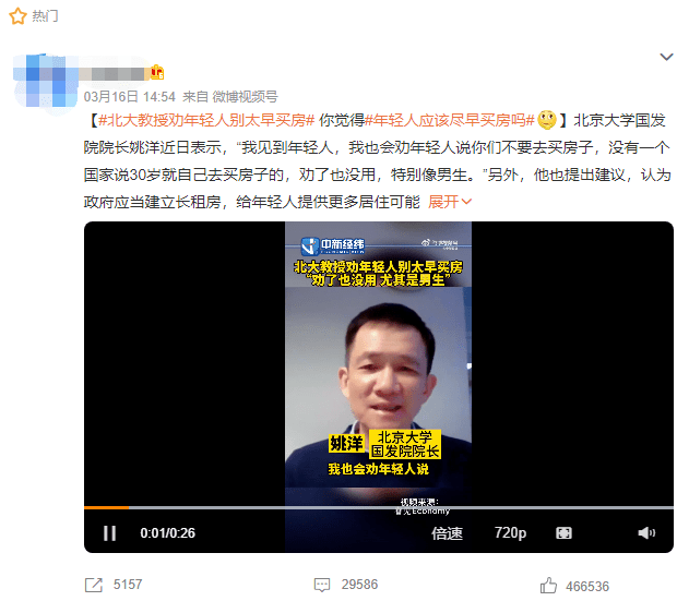 不久前,北大教授姚洋公开建议,年轻人不要过早买房。在他看来,没有一个国家的年轻人是30岁就去买房的。并表示现实中他也亲自下场劝身边人不要年纪轻轻就去买房,而现实是“年轻人偏偏不听劝”,“没房子哪行,社会已经形成这样的氛围”。