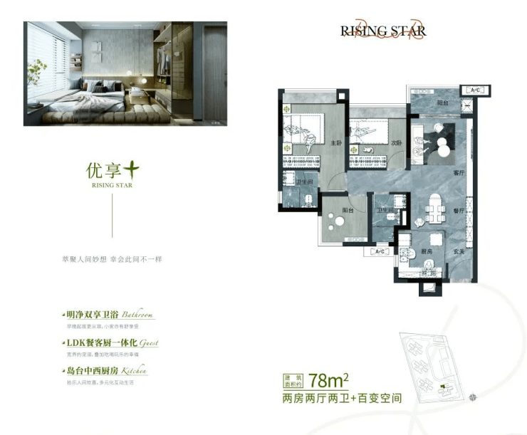 其中建面约78㎡做到了2+1房两厅两卫,该户型采用LDK一体化设计,放大了室内核心区的视觉效果;每个房间均带大飘窗,视线得以拓展的同时还增加了使用面积。更难得的是78平做成三房外主卧还带卫生间,私密性更佳。