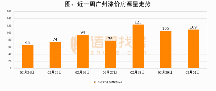 根据诸葛找房数据显示,广州24小时涨价房源量为109套,较02月29日增加4套,环比上涨3.8%。与此同时,涨价房源占比小幅扩大,业主信心有所提升。