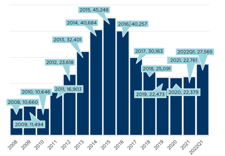 截至2022 年一季度末,全国新房住宅待售面积27,565万平方米,同比增长14.2%,较上年末增加4,804万平方米,创2018 年以来较高值。