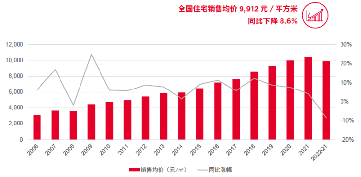 2022 年一季度,全国住宅新房成交均价为9,912元/平方米,同比下降8.6%,与2021年四季度9,920元/平方米均价基本相当。疫情反复、个人购房门槛较高、房企资金链困境等因素持续影响居民购房预期。