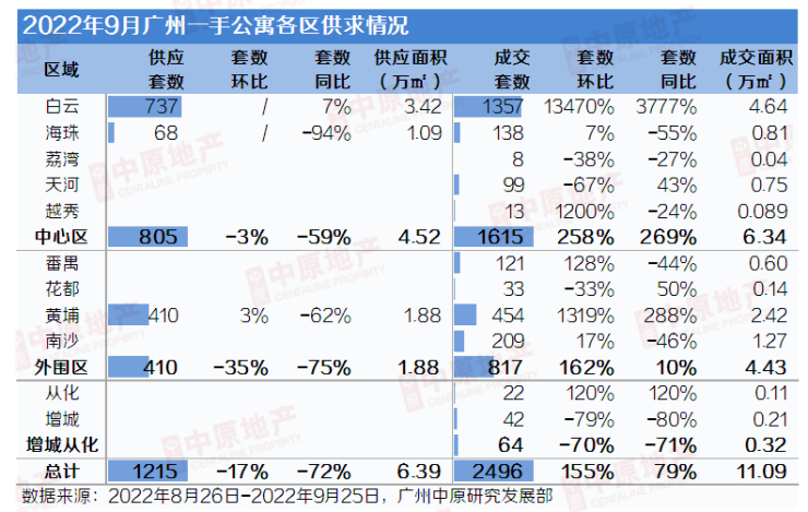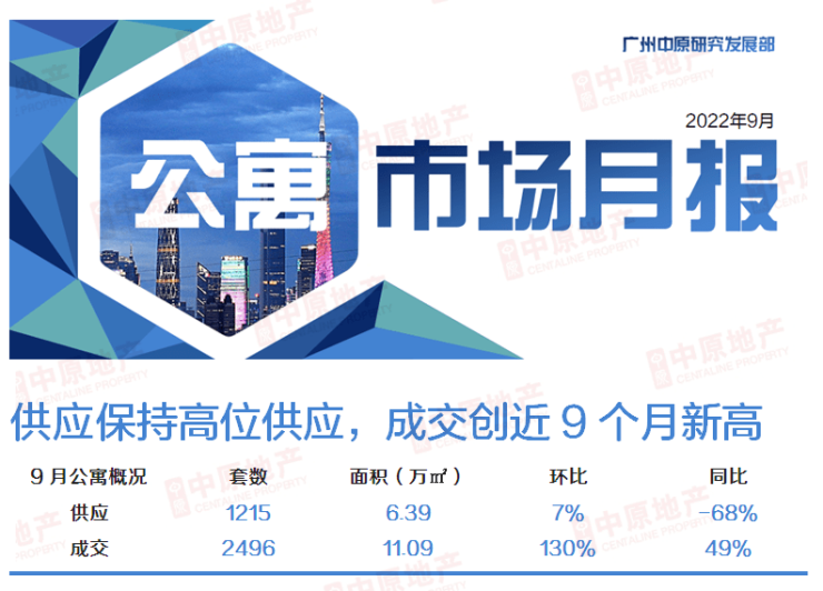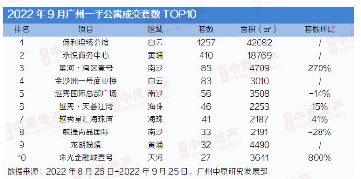 9月白云区凭借保利锦绣公馆的批量成交,公寓成交套数飙升至1357套的高位,占全市成交的54%。