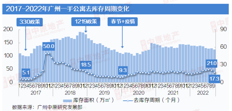 受批量交易影响,9月末广州公寓库存量降至125万㎡,去库存周期由上月的21.0个月降至17.3个月。