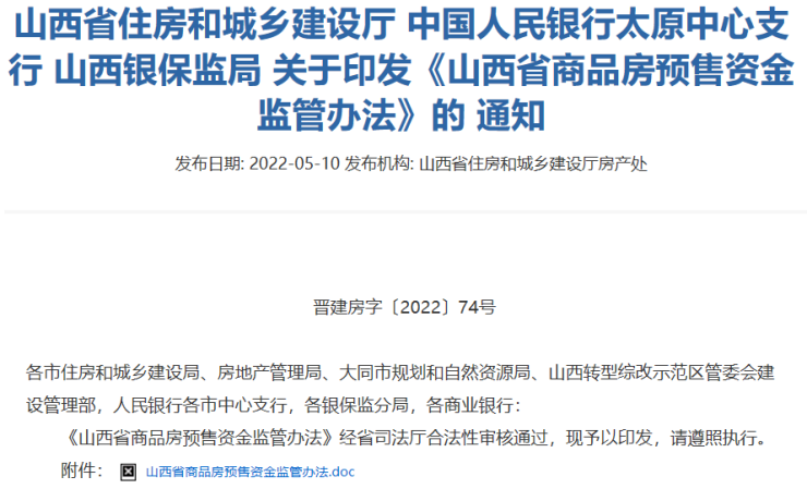 5月10日,山西省住房和城乡建设厅发布《山西省商品房预售资金监管办法》,明确施工进度达到地上主体工程封顶的,监管账户留存余额不得低于重点监管资金总额的40%等相关规定。