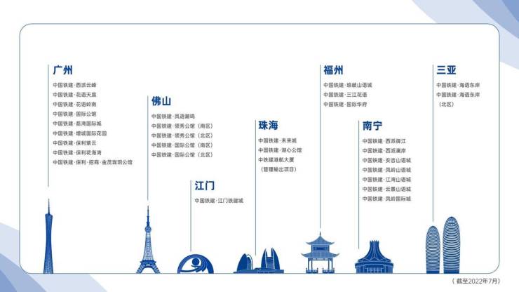 从2008年起,中国铁建地产开始深耕华南市场,先后落子于广州、佛山、南宁、福州、珠海、三亚、江门等7个城市。一直践行着“美好生活建造者”的初衷,为华南人居生活匠造中高端住宅,力求为人民打造安心幸福的美好生活。
