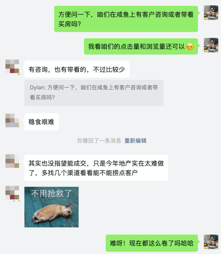 血拼哥跟一位房产中介聊了聊,发现他在多个平台(闲鱼、淘宝、小红书等)都非常活跃,成交虽然没有,但还是有客户咨询和带看的。