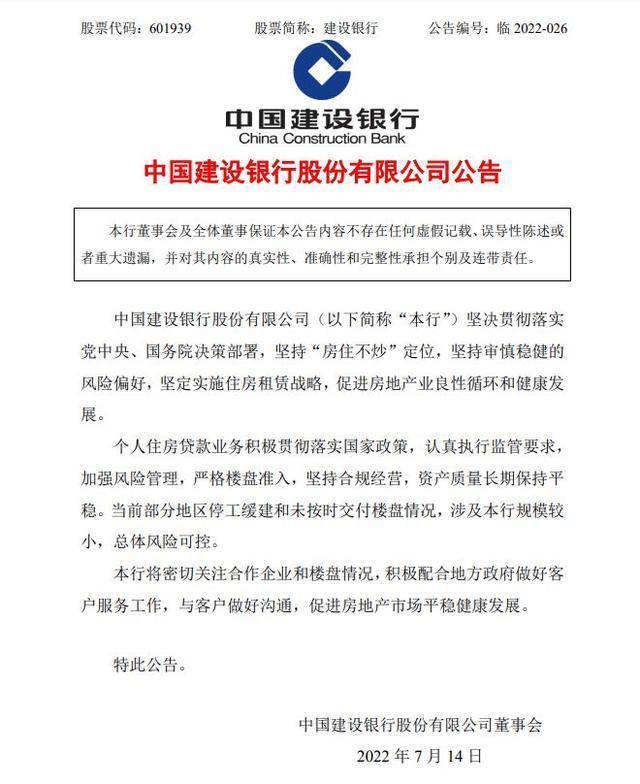 建设银行发布公告称,当前部分地区停工缓建和未按时交付楼盘情况,涉及本行规模较小,总体风险可控。建设银行将密切关注合作企业和楼盘情况,积极配合地方政府做好客户服务工作,与客户做好沟通,促进房地产市场平稳健康发展。