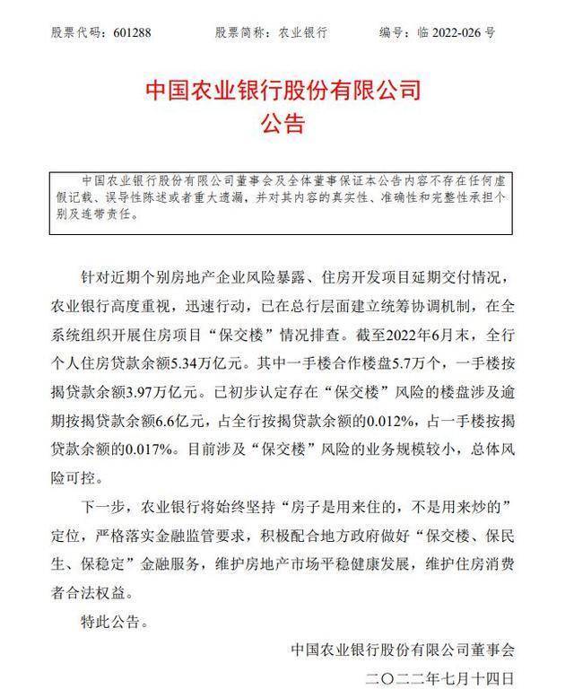 农业银行发布公告称,针对近期个别房地产企业风险暴露、住房开发项目延期交付情况,农业银行高度重视,迅速行动,已在总行层面建立统筹协调机制,在全系统组织开展住房项目“保交楼”情况排查。