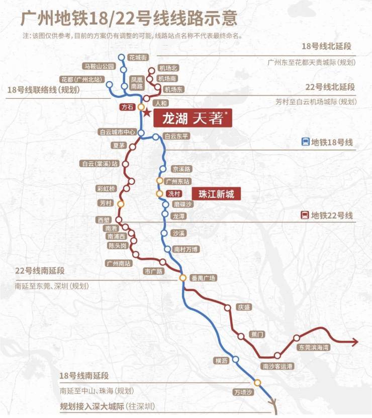 据了解,龙湖天著紧邻湾区大动脉,双高速地铁18/22号线北延线“方石站”(目前18号线首通段已经通车,北延段已经动工建设),未来从项目出发,2站嘉禾望岗,经18号线五站可达珠江新城,经22号线三站可达白云机场、半小时畅达广州南站,远期还将直接坐到东莞、深圳。