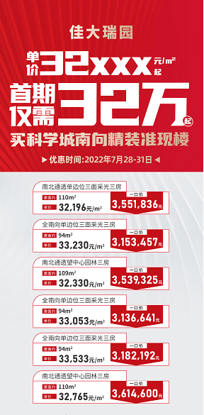 科学城的佳大瑞园近日推出6套一口价单位,单价32xxx元/㎡起,首付32万起,此外项目还是黄埔难得的准现楼,今年买明年住,大大缩短交楼时长。