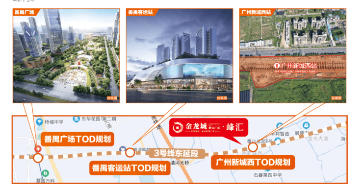 金龙城财富广场位于三号线东延段广州新城西站旁,广州新城西站将以TOD“轨道+产业+社区”的模式开发,同时坐享番禺客运站TOD、番禺广场TOD红利。从项目广州新城西站出发,2站番禺广场、3站万博CBD,3站珠江新城CBD(换乘18号快线)、3站南沙自贸区、4站广州南站。