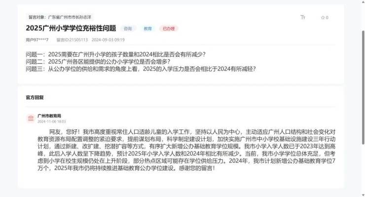2024年年底,广州教育局曾在公开答复中表示,全市小学入学人数已于2023年达到高峰,此后入学人数呈下降趋势,预计2025年小学入学人数和2024年相比有所减少。尽管全市小学学位总体充足,但考虑到小学在校生规模仍处在上升阶段,部分热点区域可能存在学位供给压力。