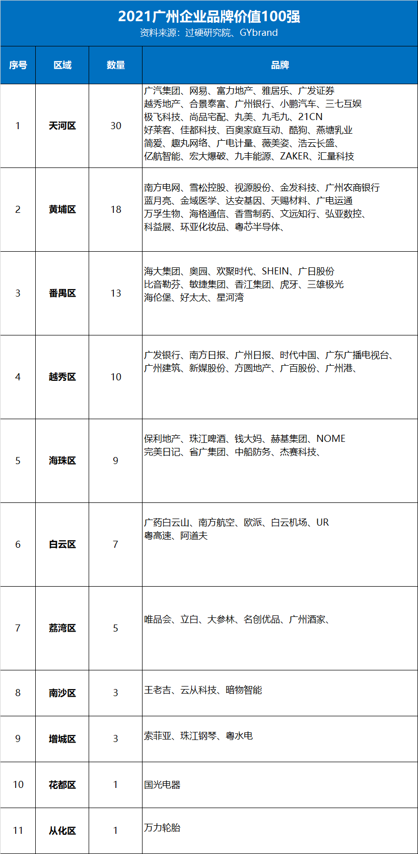 下面是过硬研究院发布的“2021广州较具价值品牌100强名单”,我们将100个品牌进行区域划分: