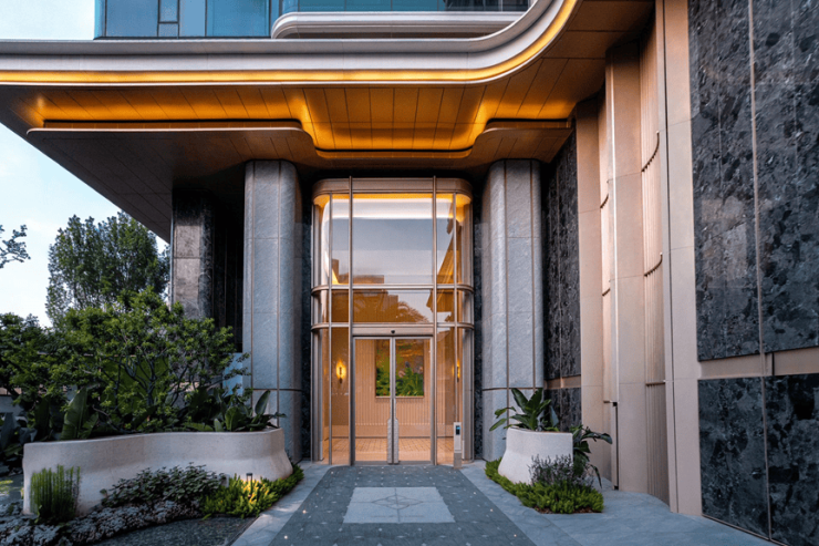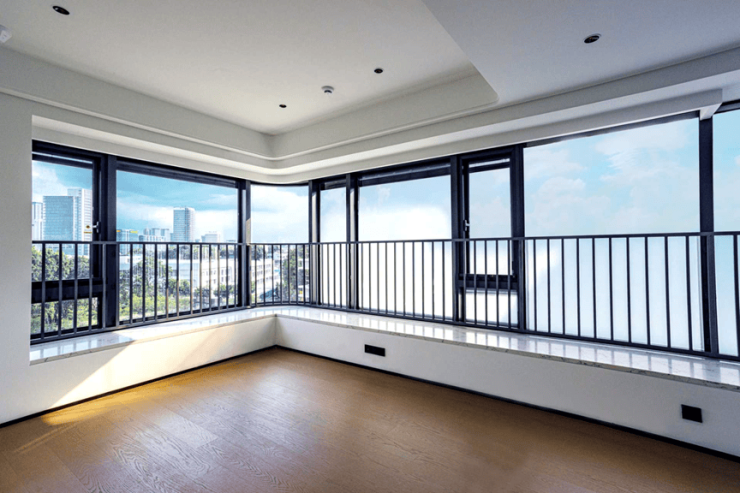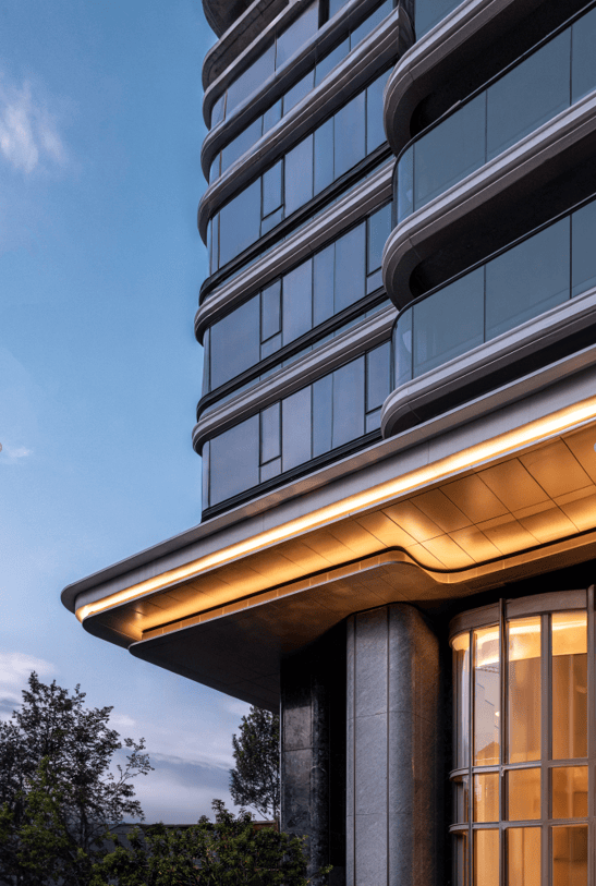 高颜值的公建化立面,呈现曲线流体之美,无柱转角弧形窗搭配鎏金曲线铝板+LOW-E中空玻璃幕墙,构建约87%高窗墙比、270°环幕视野,呈现出惊艳的辨识度和城市地标感。