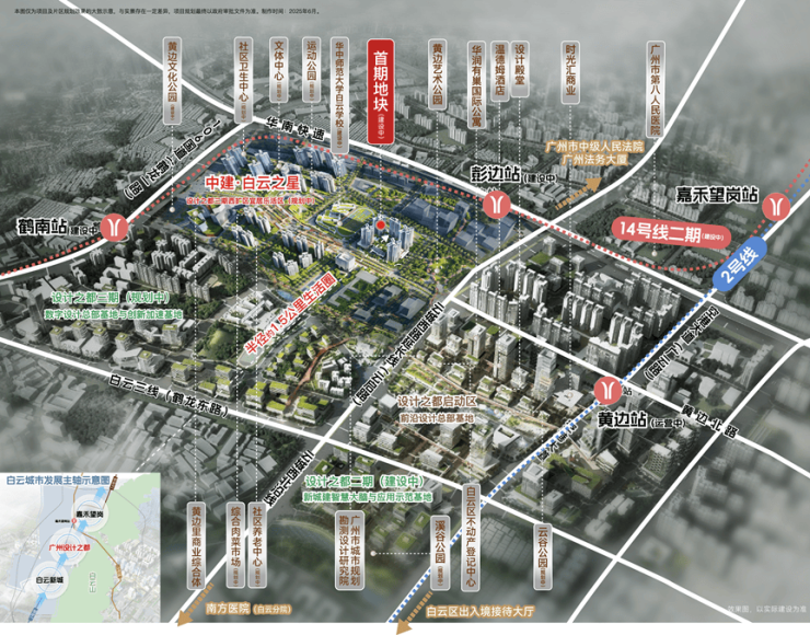 在交通出行方面,中建·白云之星直线距离约800米2号线黄边站(运营中),直线距离约200米14号线彭边站(预计2025年9月通车)、直线距离约1km鹤南站(建设中);同时,周边紧邻着华南快速路、空港大道等多条主干道,快速通达大湾区。