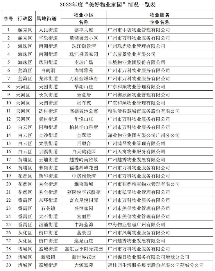 住建局表示,为深入贯彻落实习近平总书记“在营造共建共治共享社会治理格局上走在全国前列”的重要指示精神,着力推动物业服务规范化、品质化,增进业主的获得感、幸福感、安全感,按照“已成立物业小区党组织或业主委员会党组织;已成立物业管理委员会或业主委员会;已引入专业的物业服务企业;已建立协调运行机制;业主对物业服务满意度高、获得感强”的标准,评选出广州市2022年度“美好物业家园”。