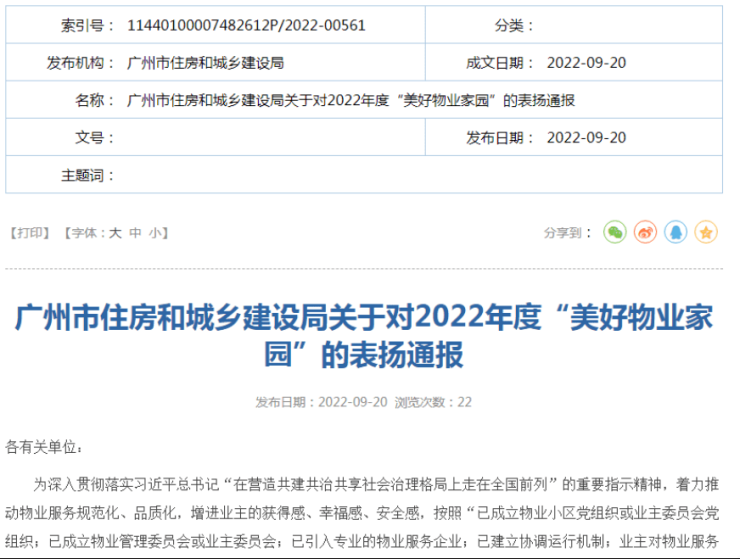 9月20日,广州市住房和城乡建设局通报表扬30个物业小区。