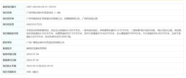 依广东省投资项目在线审批监管平台信息,瑶台城中村改造项目(一期)已备案获批,总投资超26亿元,将建5栋24层住宅楼、3栋22层办公楼。