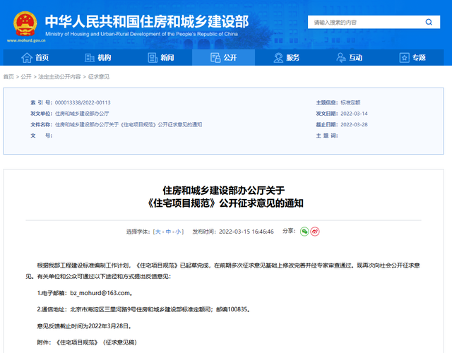 3月15日,住房和城乡建设部办公厅发布关于《住宅项目规范》公开征求意见的通知。通知显示,根据住建部工程建设标准编制工作计划,《住宅项目规范》已起草完成,在前期多次征求意见基础上修改完善并经专家审查通过。