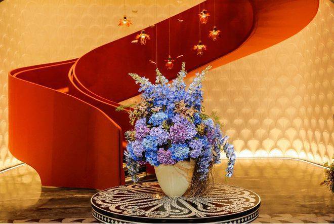 生活馆天花以凤凰花为核心元素,由上海海鸥丽晶酒店漆画的同位画师现场手工绘制,耗时3个月,方呈凤舞九天的典雅。