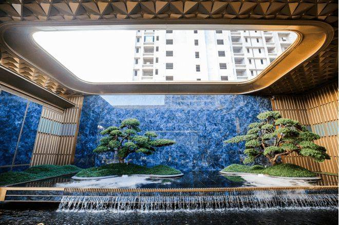 步入内庭,园境铺陈于眼前——约450㎡下沉庭院以画入境,以元代倪瓒山水画为灵感,远山、近松、水为底,精选造型景石、黑松、雅奢石材,将山川河岳浓缩其中,营造东方禅意之美,实现场景独立、边界模糊无界雅奢空间。