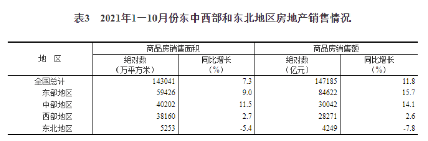 分地区看,东部地区商品房销售面积59426万平方米,同比增长9.0%;销售额84622亿元,增长15.7%。中部地区商品房销售面积40202万平方米,增长11.5%;销售额30042亿元,增长14.1%。西部地区商品房销售面积38160万平方米,增长2.7%;销售额28271亿元,增长2.6%。东北地区商品房销售面积5253万平方米,下降5.4%;销售额4249亿元,下降7.8%。