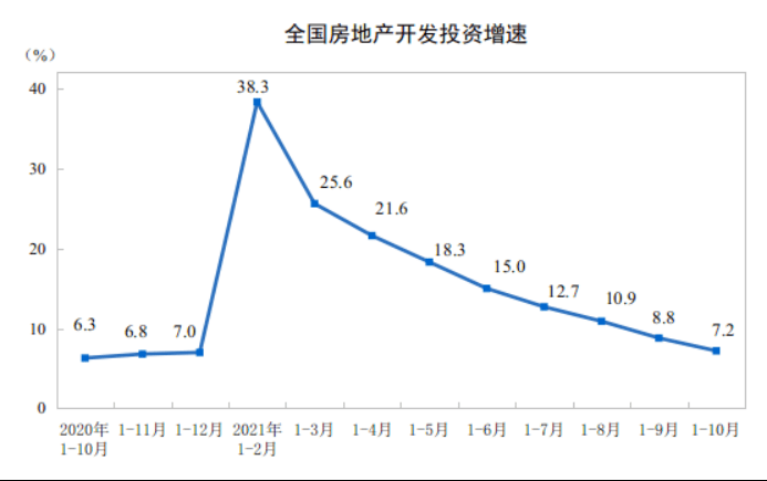 1月至10月,全国房地产开发投资124934亿元,同比增长7.2%;比2019年1-10月份增长14.0%,两年平均增长6.8%。其中,住宅投资94327亿元,增长9.3%。