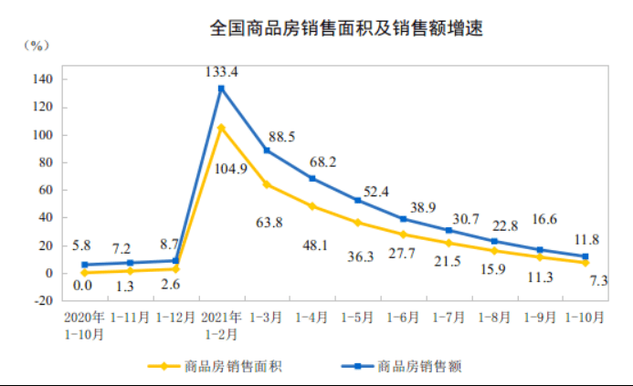 不过,前10月,全国商品房销售额147185亿元,增长11.8%;比2019年前10月增长18.3%,两年平均增长8.8%。其中,住宅销售额增长12.7%,办公楼销售额下降1.6%,商业营业用房销售额下降0.6%。