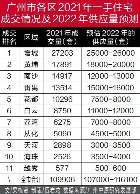 广州市各区2021年一手住宅成交情况及2022年供应量预测