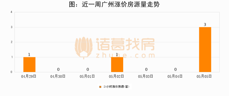 根据诸葛找房数据显示,广州24小时涨价房源量为3套,较05月04日增加3套,环比上涨0%。与此同时,涨价房源占比小幅扩大,业主信心有所提升。