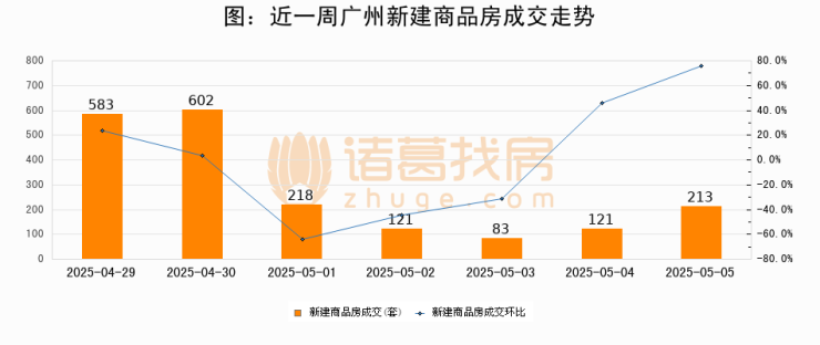 根据广州市住房和城乡建设局数据显示,2025年05月05日广州新建商品房成交213套,较昨日增加92套,环比上涨76%