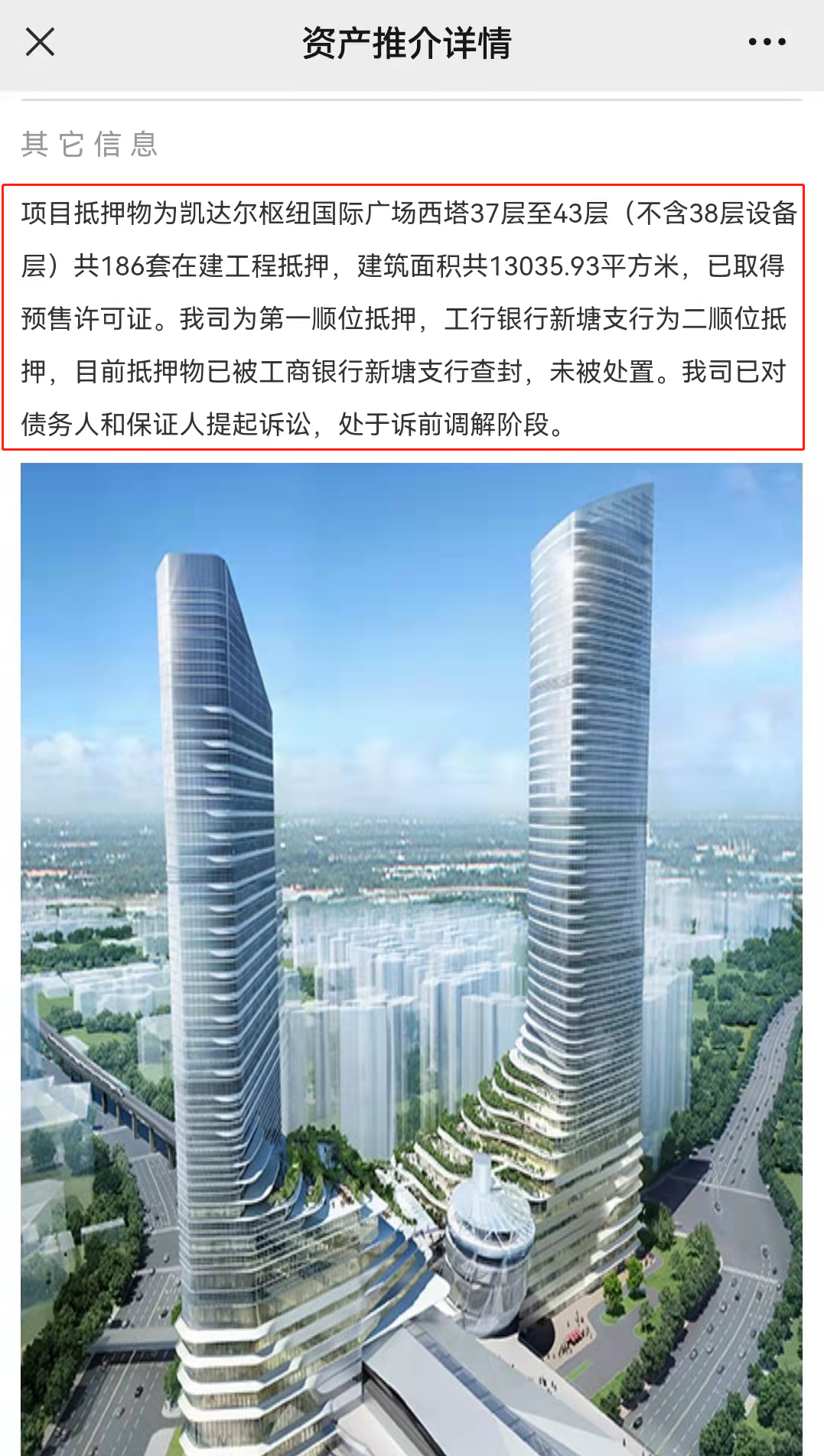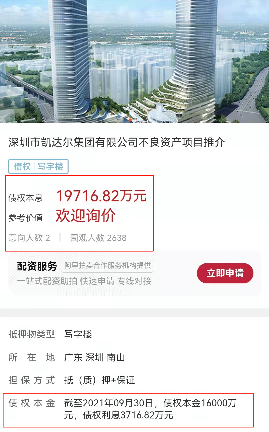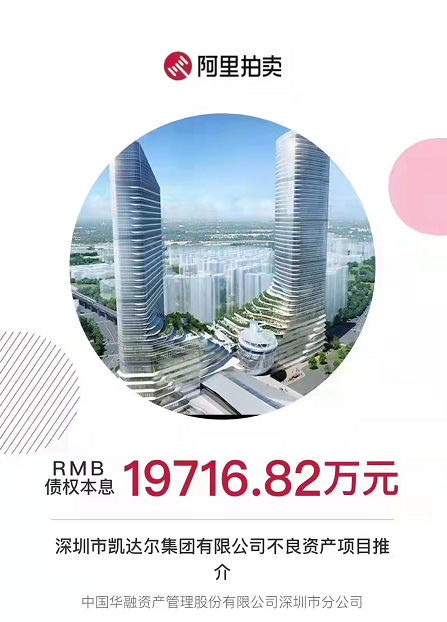 事实上,这已不是凯达尔项目的排名前列次抵押。阿里拍卖另一则拍卖信息显示,深圳凯达尔集团已负债务本金3.4亿,由此产生的利息及违约金已高达4200万,而债权人同样时中国华融,抵押物则是“凯达尔枢纽国际广场西塔10-28层在建工程,合计约3.49万平方米”。