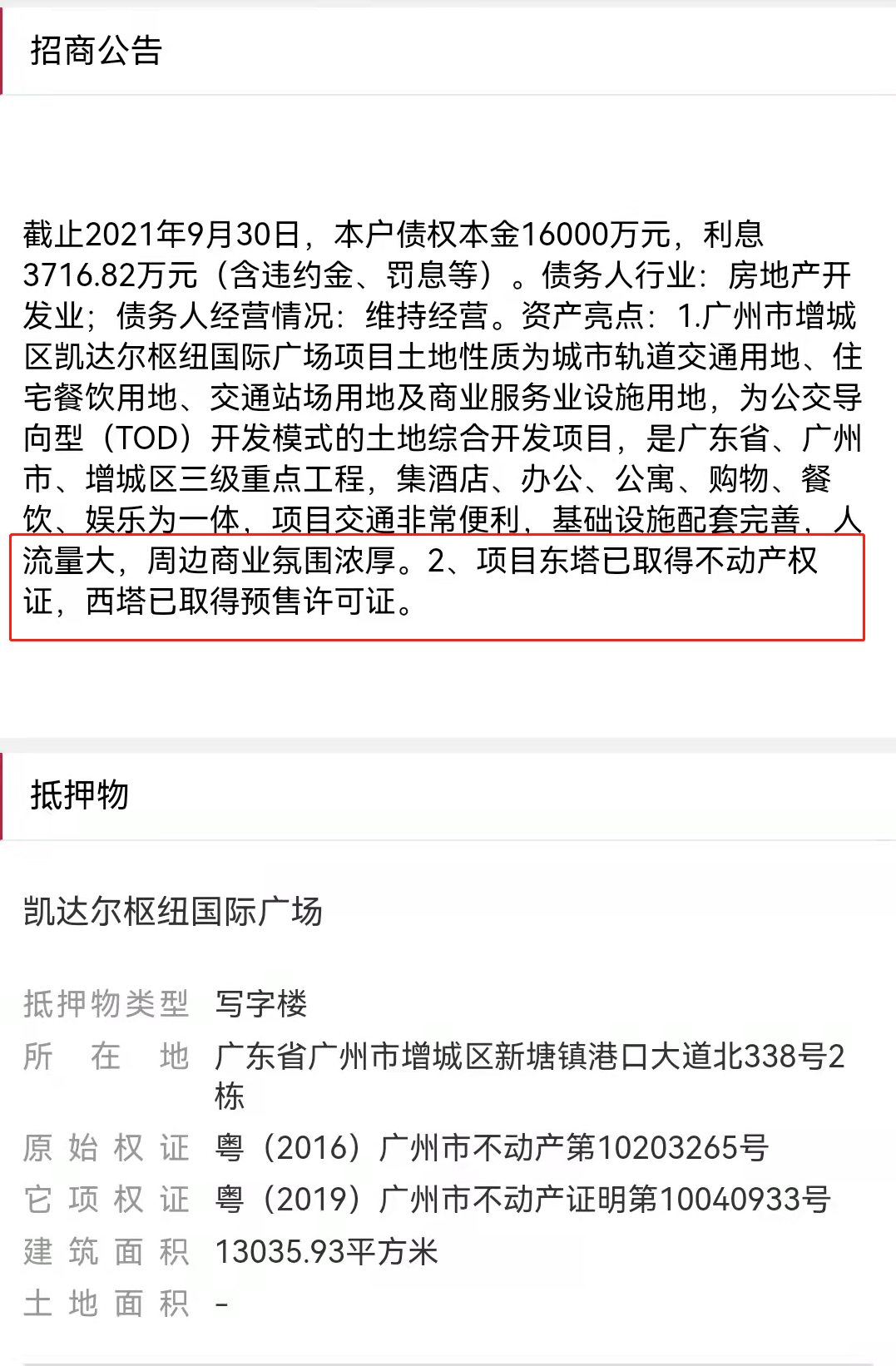 然而,截止至2021年9月30日,该笔债务已经产生逾期利息3716.82万元,这也意味着凯达尔该笔借款已经出现逾期。而债权人华融资产,准备将该债权以转让的方式进行处置,债权本息合计1.97亿元。另外,从公告信息中还能发现,凯达尔国际广场东塔已经取得不动产权证,而西塔也取得了预售许可证。