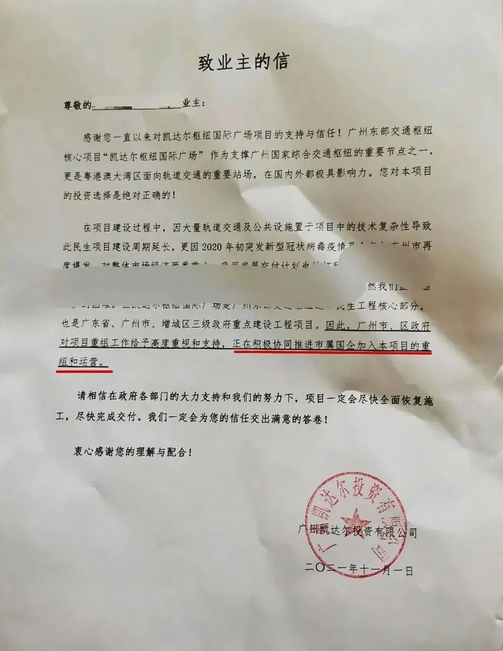 去年11月,广州凯达尔投资有限公司给业主发送了一封信,信里提到正在积极协同推进市属国企加入本项目的重组和运营。