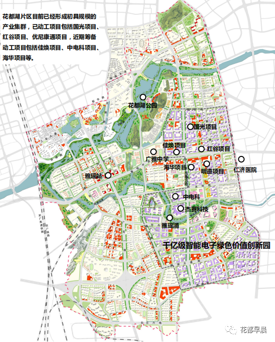 ✔功能布局:围绕花都湖,规划布局商业商务、大型居住、工业总部、文化休闲等功能区。