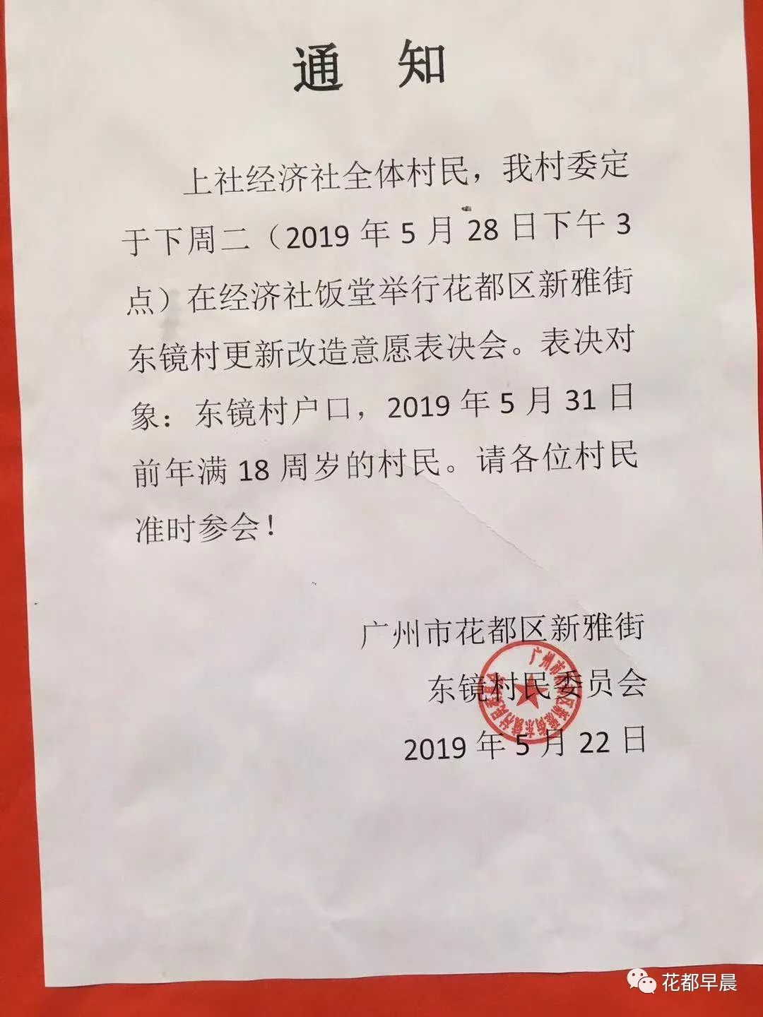 2019年5月28日,东镜村民委员举行更新改造意愿表决会,征求村民对于改造的意见。