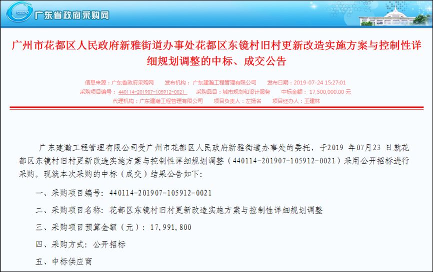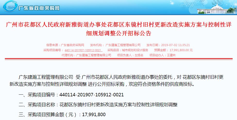 2019年7月2日,东镜村旧改实施方案与控制性详细规划调整公开招标。