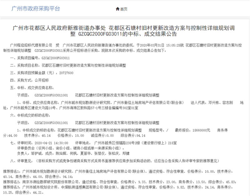 2020年4月,石塘村全面改造项目更新改造方案与控制性详细规划调整顺利完成招投标工作,并已在广州市政府采购网进行公示。