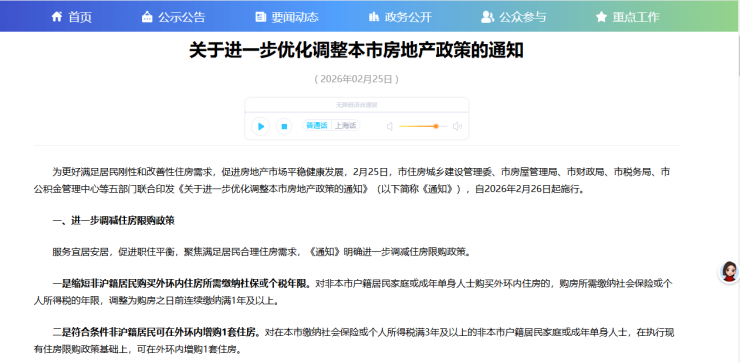 2月25日,上海正式发布2026年首个房地产新政——“沪七条”,旨在更好满足居民刚性和改善性住房需求。该政策由市住建委、市房管局等部门联合印发,涉及限购、公积金及房产税三大领域调整,并于2月26日起施行。