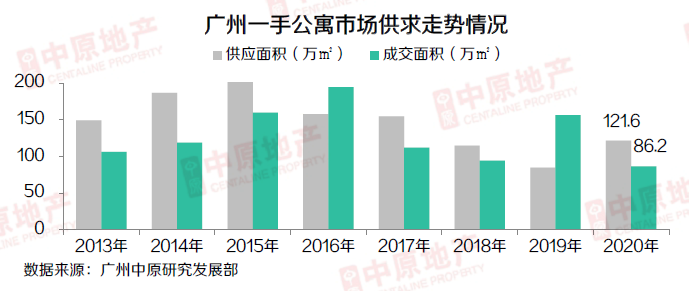 广州公寓市场结束连续4年的跌势,2020年供应量较2019年的历史低位增长44%,共入市20407套121.6万㎡公寓。