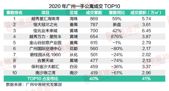 南沙、花都两个主力区继上一年密集消化后,2020年以旧盘的销售为主,区域成交下滑明显,成交量同比跌幅超5成。