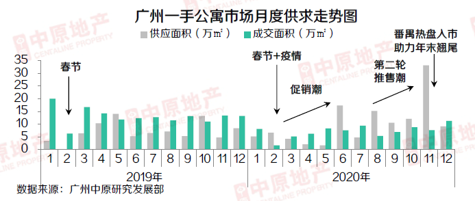 2月末开发商启动低价促销策略,带动外围区项目跑量,市场成交开始逐渐复苏。年中经历短暂回落后,中心区项目加入促销潮,外围区推盘节奏恢复正常,市场步入第二轮推售潮。10月下旬,番禺区热盘高调入市,助力市场成交企稳。