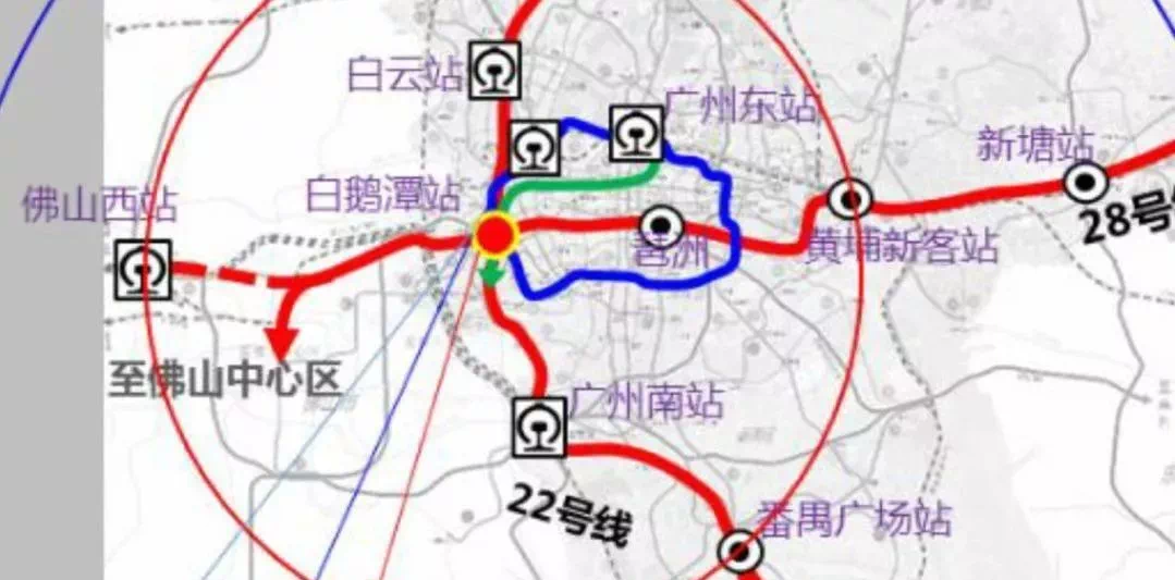 22号线:从南沙经广州南站至白鹅潭、广州站、白云站至白云机场,并往东南向东莞延伸,目前番禺广场至白鹅潭段建设中。