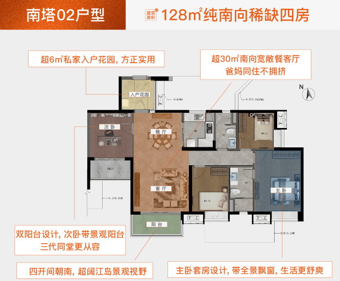 该户型四开间朝南,设置约6㎡私家入户花园,格局方正实用,可由业主根据自身需求“变装”鞋柜、收纳、置物空间,为生活场景增加缓冲区;拥有超30㎡的南向宽敞餐客厅,以宽厅尺度打造多功能家庭活动中心,满足用餐、娱乐、工作、休闲、社交等多种生活场景,三代人同住也不会显得拥挤;创新设计双重观景阳台,书房与景观阳台连通,居者在阅读的时候也能眺望珠江美景;主卧采用套房式设计,带南向全景飘窗,独立卫浴也南向采光,优质岛居生活于此一步到位。